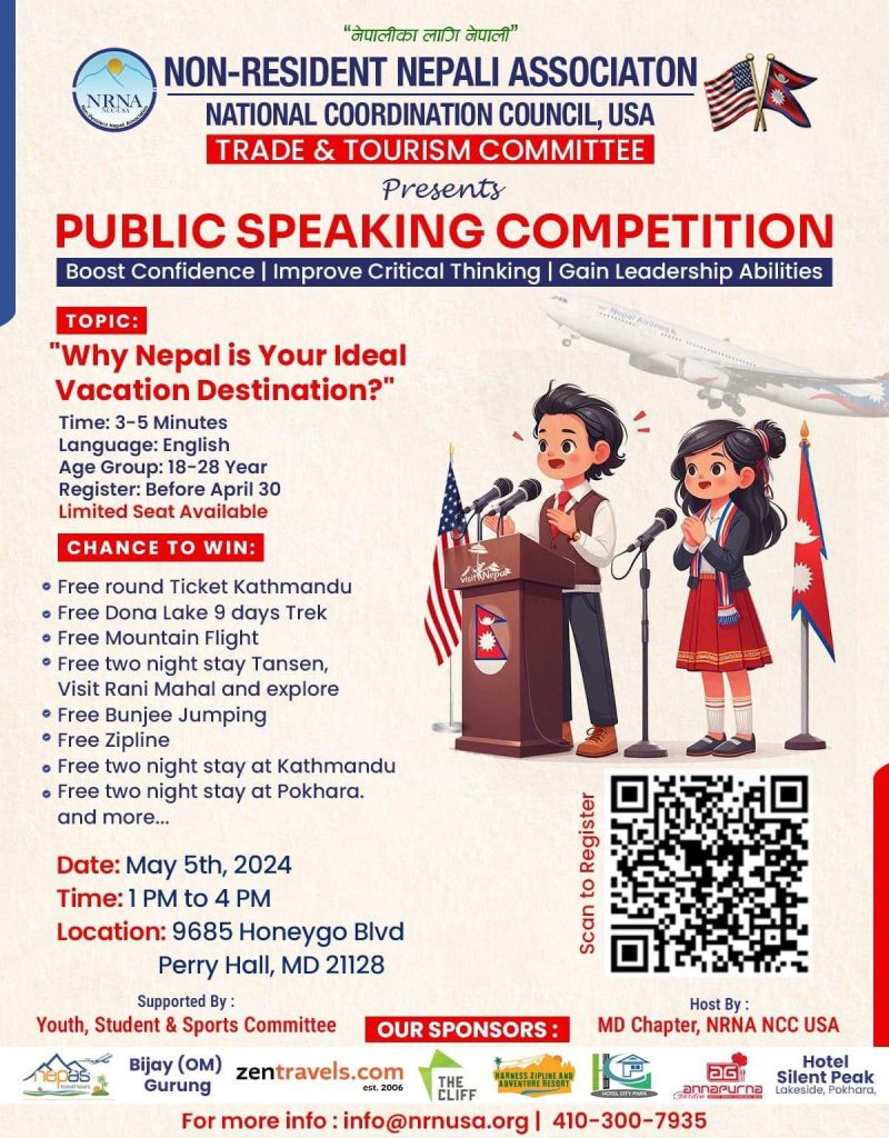 गैर आवासिय नेपाली संघ (एनआरएनए) अमेरिकाले नेपाली युवा लक्षित स्पिच कम्टिसनको आयोजना गर्ने भएको छ । एनआरएनए अमेरिकाले आगामी मे ५ तारिकका दिन मेरिल्याण्ड राज्यको 9685 honeygo Blvd perry hall मा पब्लिक स्पिकिङ्ग कम्पिटिसनको आयोजना गर्ने भएको हो ।