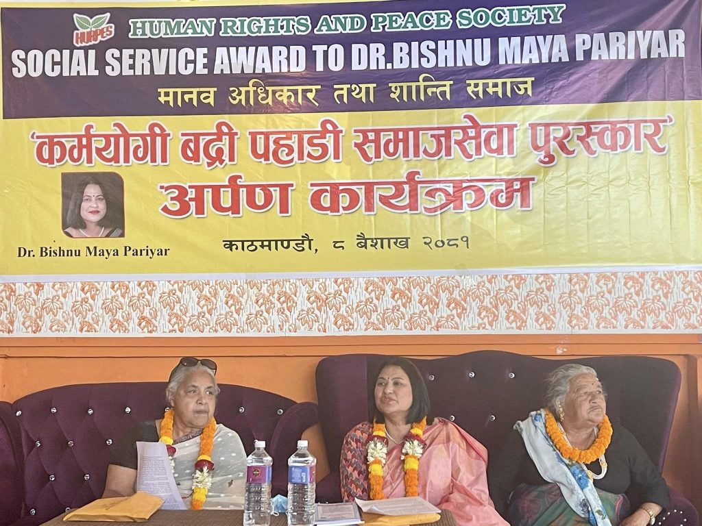 मानव तथा सामाजिक अधिकारकर्मी डा. बिष्णु माया परियार यस बर्षको ‘कर्मयोगी बद्री पहाडी समाजसेवा पुरस्कार’ बाट सम्मानित भएकी छन् । लामो समयदेखि अमेरिकामा रहेर मानव अधिकार एवम् सामाजिक न्यायका लागि पुर्याएको महत्वपूर्ण योगदानको कदर गर्दै डा. परियारलाई कर्मयोगी बद्री पहाडी समाजसेवा पुरस्कार प्रदान गरिएको हो ।