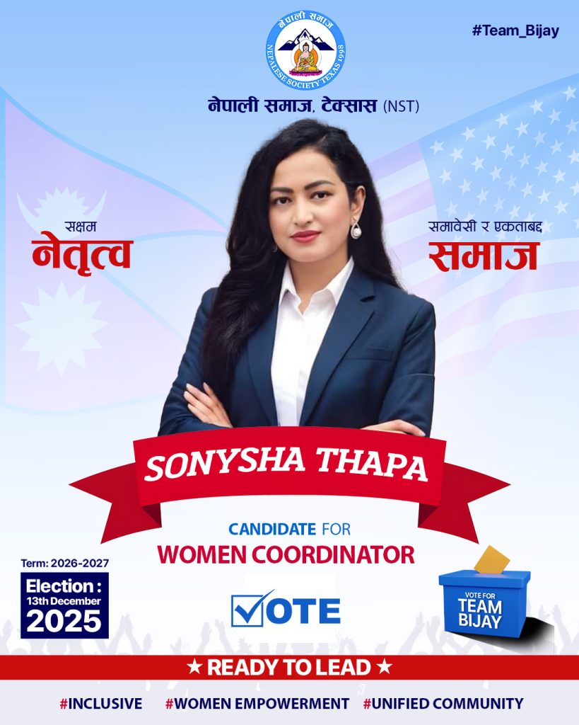 नेपाली समाज टेक्सास (NST) मा विगत दुई कार्यकालदेखि महिला विभाग तथा विभिन्न समितिहरूमा सक्रिय रूपमा योगदान दिँदै आएकी Sony Thapa (Sonysha) ले आगामी 2026–2027 कार्यकालका लागि महिला संयोजक पदमा आफ्नो उम्मेदवारी घोषणा गरेकी छन्।