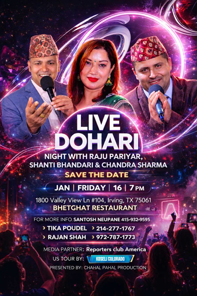 अर्भिंग, टेक्सस — नेपाली लोकसंगीतप्रेमीहरूका लागि विशेष सांगीतिक कार्यक्रम “Live Dohori Night” आयोजना हुने भएको छ। चर्चित दोहोरी गायक राजु परियार, लोकप्रिय गायिका शान्ति भण्डारी तथा गायक चन्द्र शर्माको प्रत्यक्ष प्रस्तुति रहने उक्त कार्यक्रम जनवरी १६, शुक्रबार साँझ ७ बजे इर्भिङस्थित भेटघाट रेस्टुरेन्टमा सम्पन्न हुनेछ।
