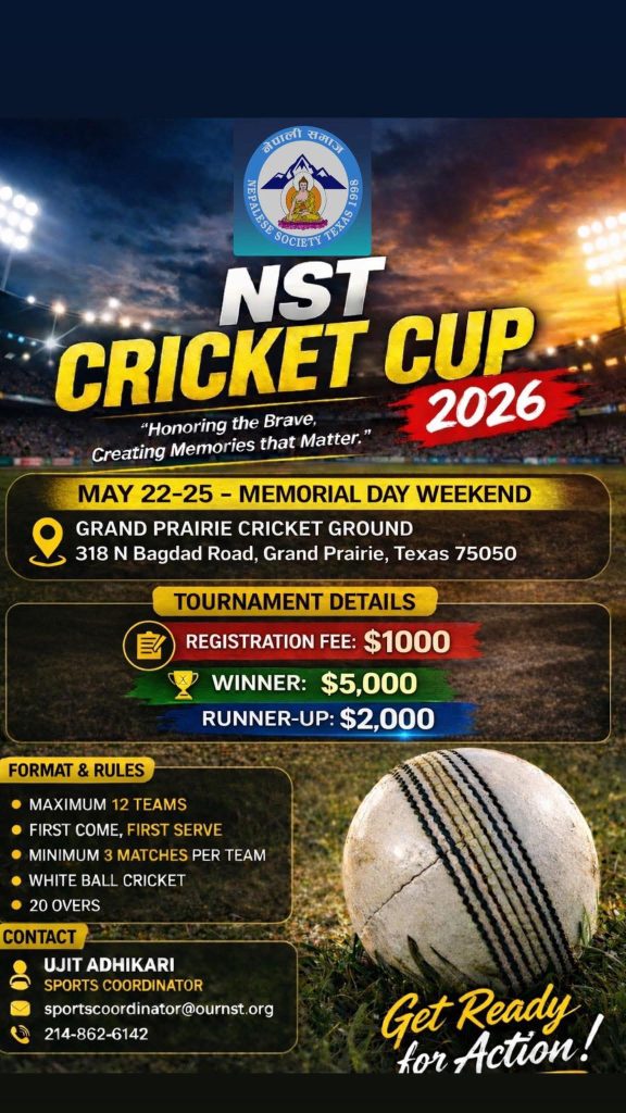 Nepalese Society Texas (NST) को आयोजनामा “एनएसटी क्रिकेट कप २०२६” आयोजना हुने भएको छ। नेपाली समुदायबीच खेलकुदमार्फत एकता, सहकार्य र सद्भाव अभिवृद्धि गर्ने उद्देश्यसहित पहिलोपटक यस्तो क्रिकेट प्रतियोगिता गर्न लागिएको हो।